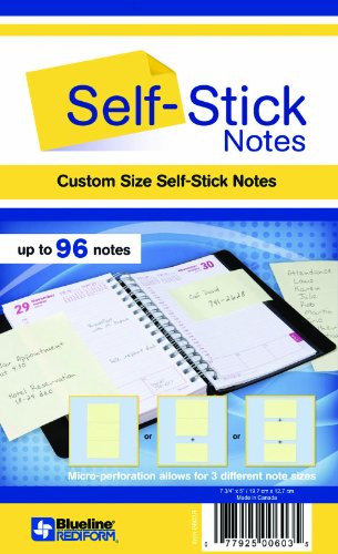 Custom size self stick notes. Pack of 2 self-stick note books. Perforated to allow for up to 3 different note sizes. Includes up to 96 notes.