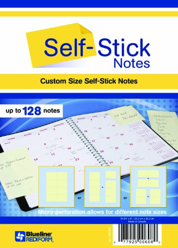 Custom size self stick notes. Pack of 2 self-stick note books. Perforated to allow for up to 8 different note sizes. Includes up to 128 notes.