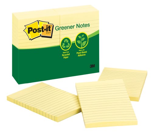 Post-it Greener Notes in 4 in x 6 in size are made from 100% recycled paper and a plant-based adhesive - which means no new trees were used. The plant material used to make the adhesive was replenished after harvesting. Get your message across with Canary Yellow Notes. Keep your thoughts straight with lined pads. 12 Pads/Pack.